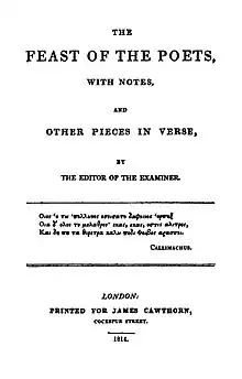 The Feast of the Poets is a poem by Leigh Hunt that was originally published in 1811 in the Reflector. It was published in an expanded form in 1814, and revised and expanded throughout his life (see 1811 in poetry, 1814 in poetry). The work describes Hunt's contemporary poets, and either praises or mocks them by allowing only the best to dine with Apollo. The work also provided commentary on William Wordsworth and Romantic poetry. Critics praised or attacked the work on the basis of their sympathies towards Hunt's political views.