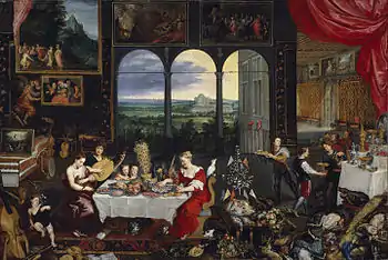 In Taste, Hearing and Touch, the central scene is a meal; a lutenist is playing and children singing, epitomising hearing, while one young woman strokes a mink in her arms, representing touch, and another is about to eat oysters, representing taste. Details such as the clavichord and other musical instruments on the left relate to hearing, and a monkey is pulling the hair of a Cupid, a form of touch. The room and the hall visible in the right rear display pictures which are also related to the three senses: The Annunciation and Minerva's Visit to Parnassus (hearing), The Dentist (touch), and The Punishment of Rich Epulon and The Wedding at Cana (taste).[4]