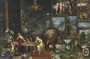 The two paintings were commissioned by the City of Antwerp to be presented to the archducal couple, and were executed by "twelve of the best masters of [the] city". They were paid for in October 1618.[2] In 1619 they were in the audience chamber at Tervuren castle. In 1731 they were destroyed in the fire at Coudenberg Palace. The surviving pair are close copies by Brueghel, Gerard Seghers, Frans Francken the Younger and Joost de Momper;[3][4][5] they were in Spain by 1633,[2] where they were housed in various royal palaces before becoming part of the foundation collection of the Prado in 1819.[3]