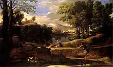 The Seasons are a continuation of Poussin's mythological landscapes, depicting the power and grandeur of nature, "benign in Spring, rich in Summer, somber yet fruitful in Autumn, and cruel in Winter."[4] The series also represents successive times of the day: early morning for Spring, midday for Summer, the evening for Autumn, and a moonlit night for Winter. For both stoic philosophers and for early Christians the seasons represented the harmony of nature; but for Christians the seasons, often depicted personified surrounding the Good Shepherd, and the succession of night and day also symbolized the death and resurrection of Christ and the salvation of man (1 Clement 9: 4–18, 11: 16-20 s:1 Clement (William Wake translation)).
