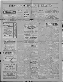 The Frostburg Herald was a weekly newspaper that was published from 1903 to around 1906 in Frostburg, Maryland, U.S. by John J. Robinson, a former coal miner.[1][2] Robinson was also the editor of The Lonaconing Star from 1886 to 1905 in nearby Lonaconing, Maryland.[3] The Herald's motto proclaimed that the publication was "Independent--Not Neutral," the same motto that Robinson used for the Star.[4] The newspaper's editorial positions advocated for honest government and a fair shake for the working people of Maryland. Robinson made it known that the intent of his paper was "to boldly, jealously and relentlessly do all in its power to safeguard the interests of the people," exemplifying this in the same issue with an exposé of the Frostburg city council's secret meetings under the headline: "The People Were Not Consulted."[4]