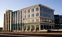 Construction was underway again in March 2014, with Martin-Harris Construction as the general contractor. The first office and residential tenants were expected to begin moving in later that year.[21][22] HMS Holdings signed a deal to become the first major office tenant, leasing 65,000 sq ft (6,000 m2) in The Gramercy.[23] Regus also signed on as an office tenant.[24] Other tenants have included Bank of Internet USA, CalAtlantic Homes, and Liberty Mutual.[25] WGH believed that there was strong demand in the area for restaurants, prompting the decision to include several eateries at The Gramercy. Retail was no longer planned for the project, and options were being considered for the decrepit nine-story tower.[14] The Gramercy's opening was marked on November 6, 2014, with the installation of a 10,000-pound letter "G" sculpture.[26]