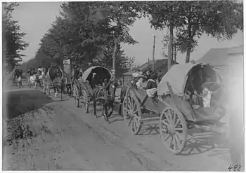 Shippey notes the likeness of the phrase used by Bard of Laketown in The Hobbit, urging the townsmen "to fight to the last arrow", to the wartime "fighting to the last round" (his emphasis). He finds a second parallel in the town's fight against the dragon Smaug with "a company of archers that held their ground ...", stating that "holding one's ground" speaks of "modern coolness and preparation" rather than "ancient 'berserk' fury".[29] Another, he suggests, is the use by Saruman at Isengard of a projected burning substance, which he likens with "reference to Tolkien's own experience" to a Flammenwerfer, a German flame thrower.[30] He finds a psychological correspondence, too, between the way that the Hobbits Pippin, Merry, and above all Sam maintain a cheerfulness even when they see no hope of success, with soldiers' accounts of the Great War such as Frank Richards's 1933 Old Soldiers Never Die; he states that this forms part of Tolkien's theory of courage.[31] The opposite, defeatism, is to Tolkien a great evil; Shippey remarks that "with his best friends dead in Flanders", Tolkien hated it "like poison", and that even the bad steward of Gondor, Denethor, chooses ceremonial suicide over some Vichy-style submission to the enemy.[32]