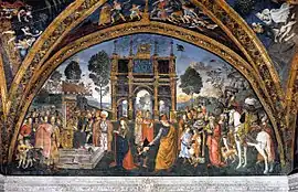 The Hall of the Saints or the Sala dei Santi is a room in the Borgia Apartment of the Vatican Palace, frescoed by the Italian Renaissance artist, Pinturicchio. It dates to 1491–1494 and was commissioned by Pope Alexander VI. The frescoes depict scenes from the lives of the saints. The ceiling fresco, which depicts myths related to the ancient Egyptian gods Osiris and Isis, has been the subject of much scholarly attention.[1] The iconographic program reflects the humanistic interests of Alexander and was likely designed by his secretary, Giovanni Annio of Viterbo.[2]