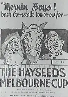 The Hayseeds' Melbourne Cup is a 1918 Australian rural comedy from director Beaumont Smith. It was the fourth in his series about the rural family, the Hayseeds, and centers on Dad Hayseed entering his horse in the Melbourne Cup.