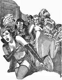 The now ultra-extroverted Otterburn takes Lucy to an expensive restaurant, where he becomes rude and offensive over what he sees as tardy service. On receiving the bill he sends Lucy on to the musical they are to attend while he forcefully disputes the liquor charge. He leaves without paying it, his personal force-field allowing him to act in relative impunity. At the theater he finds the frightened Lucy has stood him up, so he invites in a woman off the street. Unimpressed by the show, he throws tomatoes at the performers and then at the ushers when they come to kick him out. Fleeing behind the scenes he swipes a can of green paint from a scenery painter and amuses himself daubing it on half-naked chorus girls; in the ruckus created he escapes the building. Next he steals a policeman's horse for a joy ride. Abandoning it soon after, he ducks pursuit in a barbershop and contemplates more hell-raising.