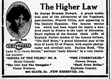 The Higher Law is a 1914 American silent drama film directed by Charles Giblyn and featuring Murdock MacQuarrie, Pauline Bush and Lon Chaney. It was written by Harry G. Stafford, based on a story by George Bronson Howard. This film was the second in a series of four films called The Adventures of Francois Villon. Lon Chaney was featured in this one, as well as in the first installment, The Oubliette (1914), but did not appear in the other two. The film is now considered to be lost.[1] The film co-starred Millard K. Wilson, who became a lifelong friend of Chaney and later served as his director in films at M-G-M.[2]