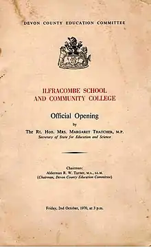 Originally opened by then Education Secretary Margaret Thatcher in 1970 and known as Ilfracombe School & Community College, it was the first purpose-built comprehensive school in the country. Subsequently, it was called Ilfracombe College. Since the early 1980s, facilities available to students have included a television studio with an editing suite. The buildings were designed by Messrs & stillman.[1] Following fundraising and negotiations from 2001, the college was awarded specialist college Media Arts status in 2004 and was renamed Ilfracombe Arts College. In 2007, the school built a £3.4 million arts block named the Beacon Arts Centre. The arts department relocated to this department, freeing up rooms for other uses in the school. The previous art rooms were refurbished into new administration, student services, and learning support areas. The previous student services were refurbished into a conference room with video conferencing facilities. The school converted to academy status in May 2013, but continues to specialise in the arts.
