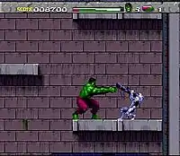 The Incredible Hulk is a 1994 video game released for the Mega Drive, Master System, Game Gear, and SNES. Developed by Probe Software and published by U.S. Gold, the game is based on the Marvel Comics superhero Hulk and showcases him within the context of a side-scrolling action game with platforming and beat 'em up elements. The narrative involves the Hulk attempting to thwart the world domination bid of his nemesis, the Leader, while engaging in combat with other arch-rivals.