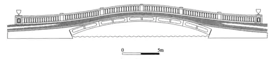 The metal segments for the bridge were cast in 1804 by William Hawks and Son of Gateshead and weighed 80 tons, along with 2 tons of lead at a cost of £1,457.[5] It's estimated that the additional cost of transportation, stonework, and construction gave a total of £10,000 for the installation of the bridge,[6][7] approximately £1 million in 2019 prices.[8]