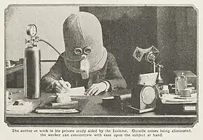 The Isolator was first introduced in the July 1925 edition of the American Physical Society magazine, with which Gernsback was affiliated.[1][3] The helmet was first created using wood and felt.[4] The mouth of the helmet had a baffle for breathing and had three pieces of glass that so users could see outside.[5] It was deemed successful, but Gernsback had estimated that it was only "75%" efficient and said it did not keep out all sounds.[6] Gernsback re-designed the device without wood and cut white lines into the glass so users could see out of the helmet. Gernsback said that the new design was 90-95% efficient and kept out almost all sounds.[6][7] However, Gernsback also noted that the helmet could only be worn for about 15 minutes at a time as the user would become drowsy.[8][9] Gernsback then added an oxygen tank to assist the user with breathing while wearing the helmet.[6][10]