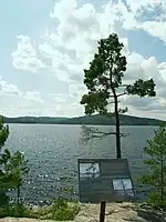 The pine depicted in the painting was located by park staff in 1970. The tree was already dead by the time of its discovery; it later fell over and was used for firewood by campers.[29] A lookout at Grand Lake now marks the site of the painting with a plaque that notes the significance of Thomson's work and depicts the painting alongside a photograph of the scene from the 1970s, before the tree fell.