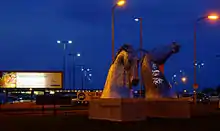 The Kelpies are 30-metre-high (98 ft) horse-head sculptures depicting kelpies, located between Falkirk and Grangemouth, but the Kelpies themselves are situated in Grangemouth,[1] standing next to an extension to the Forth and Clyde Canal, and near the River Carron, in The Helix, a parkland project built to connect sixteen communities in the Falkirk Council Area, Scotland.[2] The sculptures were designed by sculptor Andy Scott and were completed in October 2013.[3] The sculptures form a gateway at the eastern entrance to the Forth and Clyde canal, and the canal extension built as part of The Helix land transformation project. For a short time, they were the tallest equine statues in the world until Pegasus and Dragon was completed the following year.