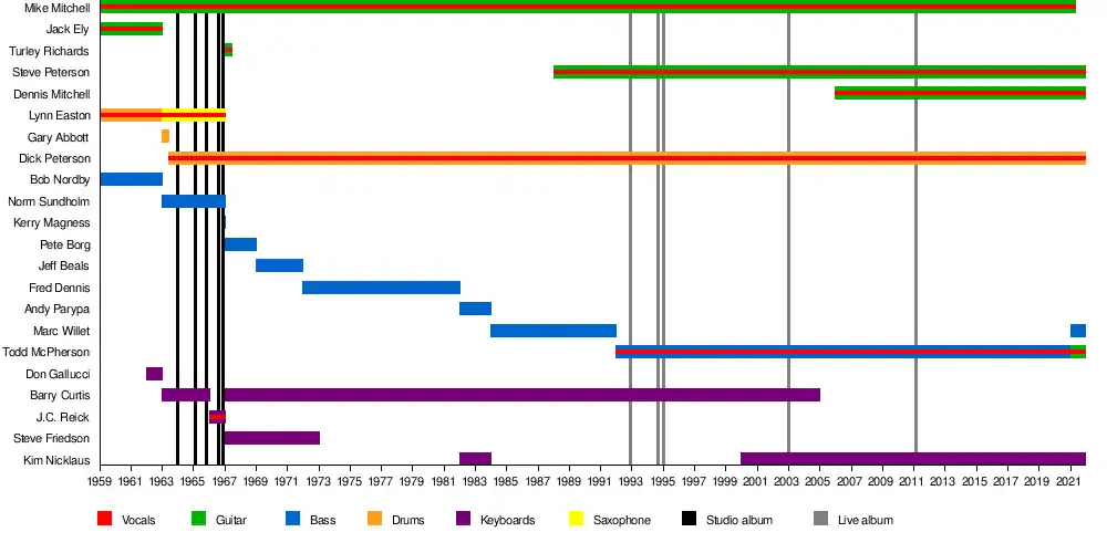 • Lynn Easton – vocals, drums, saxophone (1959–1967; died 2020)[7]