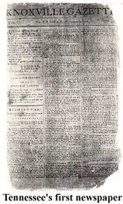 The Knoxville Gazette was the first newspaper published in the U.S. state of Tennessee and the third published west of the Appalachian Mountains.[2] Established by George Roulstone (17671804) at the urging of Southwest Territory governor William Blount, the paper's first edition appeared on November 5, 1791.[3] The Gazette provided an important medium through which Tennessee's frontier government could dispense legislative announcements, and the paper's surviving editions are now an invaluable source of information on life in early Knoxville.[1]