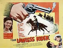 The Lawless Rider is a 1954 American black-and-white western film directed by Yakima Canutt and starring Johnny Carpenter, Frankie Darro and Noel Neill, and marketed by United Artists. Ed Wood helped co-write the screenplay, which was originally to be titled The Outlaw Marshall. The film was shot in 1952 but was not released until July 1954 due to cost overruns and legal difficulties.[2]