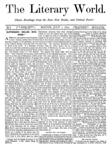The Literary World was a magazine of literary criticism, published from Boston by S.R. Crocker, which offered "Choice readings from the best new books, and critical reviews". An edition was also published from London. The magazine was first published in June 1870 and continued until 1904 when it was incorporated into The Critic.[1]