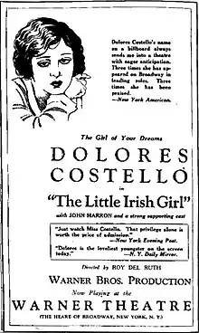 The Little Irish Girl is a 1926 American silent romantic drama film produced and distributed by Warner Bros., directed by Roy Del Ruth and starring Dolores Costello. Based on the story The Grifters, written by Edith Joan Lyttleton, it is considered to be a lost film.[1][2][3]