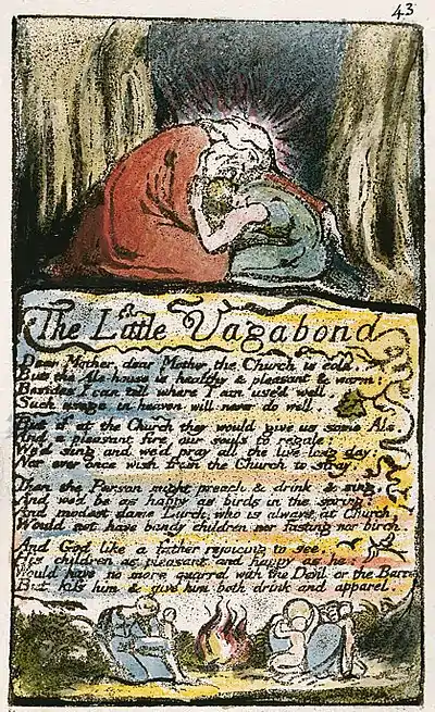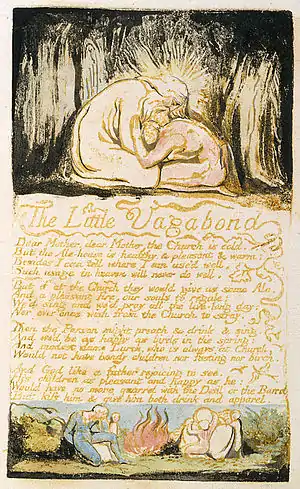The Little Vagabond is a 1794 poem by English poet William Blake in his collection Songs of Innocence and of Experience. His collection, Songs of Innocence, was originally published alone, in 1789. The scholar Robert Gleckner says that the poem is a form of transformation of the boy in the poem "The School Boy", from Songs of Innocence.[2]