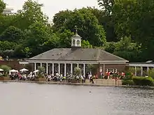 The lake formed a focal point of the 1814 celebrations which marked a century of Hanoverian rule and re-enacted the British victory at Trafalgar nine years previously,[8] and of the 1851 Great Exhibition, with the Crystal Palace standing on its southern shore.[5] Following the introduction of more stringent regulations to protect the environment in the park, the relocation of the Crystal Palace, and the construction of the nearby Albertopolis complex of museums and exhibitions, large-scale events ceased to take place on the banks of the Serpentine. However, it was the location for the 1977 Silver Jubilee celebrations,[3] and a venue for the 2012 Olympics.[9]