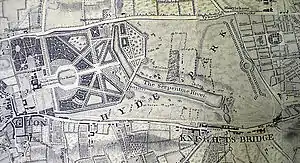 In 1730 Queen Caroline, wife of George II, ordered the damming of the River Westbourne in Hyde Park as part of a general redevelopment of Hyde Park and Kensington Gardens. Original monastic ponds may have existed in the location; these were modified as part of the 1730–1732 scheme to create a single lake.[3] At that time, the Westbourne formed eleven natural ponds in the park. During the 1730s, the lake filled to its current size and shape. The redevelopment was carried out by Royal Gardener Charles Bridgeman, who dammed the Westbourne to create the artificial lake, and dug a large pond in the centre of Kensington Gardens (The Round Pond) to be a focal point for pathways in the park.[4]