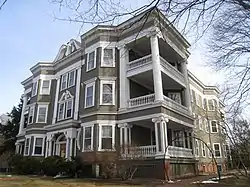 The Lowell is an historic triple decker apartment house on 33 Lexington Avenue in Cambridge, Massachusetts. Built in 1900 to a design by local architect John Hasty, it is a rare multiunit building in the Brattle Street area outside Harvard Square. The Colonial Revival building has a swan's neck pediment above the center entry, which is echoed above the central second story windows. Doric pilasters separate the bays of the front facade, and the building distinctively has side porches, giving it added horizontal massing. It was built before the decision was made to locate the electrified trolleys on Mount Auburn Street instead of Brattle (under pressure from wealthy Brattle Street residents), a decision that reduced interest in building more multiunit housing in that area.[2]