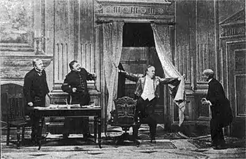 The first production opened at the Court Theatre in London on 21 March 1885. It was Pinero's first attempt at farce, after several dramas, and took audiences and critics by surprise.[1] It was very favourably reviewed, and became a box-office hit, running for a year until 24 March 1886.[2]
