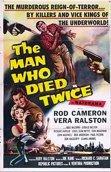 The Man Who Died Twice is a 1958 American crime film drama, directed by Joseph Kane and written by Richard C. Sarafian. The film stars Rod Cameron, Vera Ralston (in her last film role before retiring), Mike Mazurki, Gerald Milton, Richard Karlan and Louis Jean Heydt. The film was released on June 6, 1958, by Republic Pictures.[1][2][3]