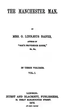The Manchester Man is a novel by the British writer Isabella Banks. It was first published in three volumes in 1876 under her married name, Mrs G. Linnæus Banks. The story follows the life of a Manchester resident, Jabez Clegg, during the nineteenth century and his rise to prosperity in the booming industrial city. It depicts a number of real historical events such as the Peterloo Massacre.[1]