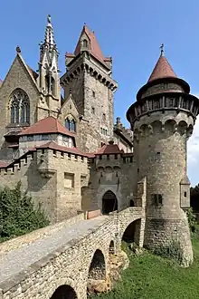 For some external shots of the cathedral, the ground was covered with cotton wool to simulate snow, at a cost of 5,000 crowns. Filming continued in the recently completed (1874–1906) mock-mediaeval Burg Kreuzenstein, also near Vienna,[37] Menchen having received permission from the owner, Count Wilczek.[3]