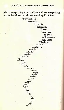 The poem foreshadows the 20th century calligramme in form, being not only in the shape of a tail but, in its handwritten version, allowing the final words to be inscribed upside-down. It has been variously described as shaped, patterned,[2] figured or emblematic verse,[3] in the tradition of such shaping that was later identified as the ancestor of concrete poetry. Carroll had control of the poem's layout in the original edition and it was he who stipulated that the font size should diminish as the poem progressed. Another commentator has explained that in this way “the poem works as a pictogram or concrete poem, in that its actual shape mimics an aspect of its subject matter. A tale told by a mouse is reproduced in the form of a mouse’s tail.”[4]