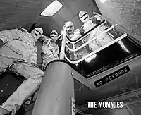 Formed in late 1988 by Trent Ruane (lead singer, organ, saxophone) and Maz Kattuah (bass guitar), the band's lineup also included Larry Winther (lead guitar), and Russell Quan (drums).[1][2] The group became a key musical force in San Francisco's emerging garage punk scene alongside the Phantom Surfers and the Untamed Youth, although the band set out to be cruder than their contemporaries.[1] The group adopted the moniker the Mummies and immediately became known for their style of dress, clothing themselves in tattered rags like monster mummies. This homemade choice of attire was influential on the local garage punk scene, with newer groups also dressing in similarly gimmicky clothing.[3]