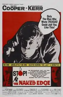 The Naked Edge is a 1961 thriller film starring Gary Cooper (in his final film role) and Deborah Kerr. The film was a British-American co-production distributed by United Artists, directed by Michael Anderson and produced by George Glass and Walter Seltzer, with Marlon Brando Sr. as executive producer. The screenplay was written by Joseph Stefano (adapted from Max Ehrlich's 1955 novel First Train to Babylon), the musical score was composed by William Alwyn, the cinematography was handled by Erwin Hillier and Tony White, and the production designer was Carmen Dillon.[3]