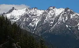 The Needles is located in the marine west coast climate zone of western North America.[2] Most weather fronts originate in the Pacific Ocean, and travel northeast toward the Cascade Mountains. As fronts approach the North Cascades, they are forced upward by the peaks of the Cascade Range, causing them to drop their moisture in the form of rain or snowfall onto the Cascades (Orographic lift). As a result, the west side of the North Cascades experiences high precipitation, especially during the winter months in the form of snowfall. During winter months, weather is usually cloudy, but, due to high pressure systems over the Pacific Ocean that intensify during summer months, there is often little or no cloud cover during the summer.[3] Because of maritime influence, snow tends to be wet and heavy, resulting in high avalanche danger.[3]