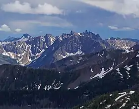 During the Pleistocene period dating back over two million years ago, glaciation advancing and retreating repeatedly scoured the landscape leaving deposits of rock debris.[4] The U-shaped cross section of the river valleys is a result of recent glaciation. Uplift and faulting in combination with glaciation have been the dominant processes which have created the tall peaks and deep valleys of the North Cascades area.
