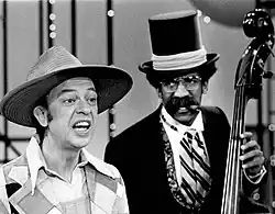 Guest star Don Knotts sings while Cosby provides the music in a skit from the show in 1973.