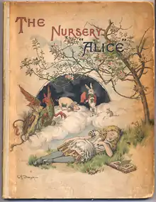 The Nursery "Alice" (1889/90)[1] is an abridged version of Alice's Adventures in Wonderland (1865) by Lewis Carroll, adapted by the author himself for children "from nought to five". It includes 20 of John Tenniel's illustrations from the original book, redrawn, enlarged, coloured – and, in some cases, revised – by Tenniel himself. The book was published by Macmillan a quarter-century after the original Alice. It featured new illustrated front and back covers in full colour by E. Gertrude Thomson, who was a good friend of Dodgson.[2] The book was 'engraved and printed' by the famous colour printer Edmund Evans.