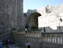 At Dubrovnik, the production used the seashore between Fort Bokar and Fort Lovrijenac to film Myrcella's departure,[8] the Pile Gate's inner gateway for the riot scene,[9] the inner terrace of Fort Lovrijenac for the refuge where the royal family hides from the mob, and the Rector's Palace for the atrium of the Spice King in Qarth. In this later location, the bust of the Croatian 16th century seaman Miho Pracat can be clearly seen.[10]