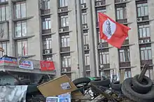 Party flag of The Other Russia in Donetsk, Ukraine during pro-Russian unrest in April 2014