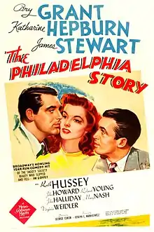 The Philadelphia Story is a 1940 American romantic comedy film[2][3] starring Cary Grant, Katharine Hepburn, James Stewart, and Ruth Hussey. Directed by George Cukor, the film is based on the 1939 Broadway play of the same name by Philip Barry,[4] about a socialite whose wedding plans are complicated by the simultaneous arrival of her ex-husband and a tabloid magazine journalist. The socialite, played by Hepburn in both productions, was inspired by Helen Hope Montgomery Scott (1904–1995), a Philadelphia heiress known for her hijinks, who married a friend of playwright Barry.[5]