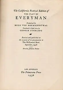 The Play of Everyman is American poet and playwright George Sterling’s adaptation of Austrian writer Hugo von Hofmannsthal’s 1911 German play Jedermann. Lavish productions of The Play of Everyman in 1917 and 1936 were acclaimed by critics and boosted the careers of people involved. Sterling’s adaptation was also staged in 1941 in New York City and 1977 in Brentwood, Los Angeles.