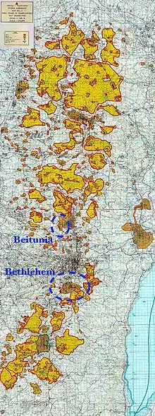 Beitunia and Bethlehem, the two locations shown in the film, on a map of the Palestinian enclaves under the Oslo II Accord. The two locations are about 20 kilometres (12 mi) apart.