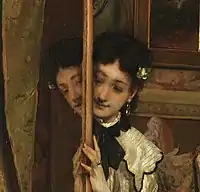 La Psyché shows a young model in Stevens' Parisian studio during a break. She is half hidden behind a mirror, through which she looks at the viewer directly in the eye. Such a large mirror, wherein one can see oneself fully, is a piece of furniture typical of the second half of the nineteenth century and, as mentioned, it was also called psyché.[2] The title of the painting, however, also refers through the furtive glance of the young woman to the myth of Psyche, who was forbidden to look at her beloved Amor, but secretly could not resist.