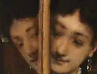The Parisian dandy Robert de Montesquiou, who was the main inspiration for Baron de Charlus in Proust's À la recherche du temps perdu, was one of the early owners of La psyché.[4] Of the work he wrote that it is "as if an apotheosis of Stevens' art and of his loves: the women, the objects and the reflections they multiply". As mentioned, on a chair there are the Japanese prints that the artist was so fond of.[5] Montesquiou, however, was especially fascinated by the trinkets and other exotica that better suited him and his own lifestyle. He summarized the rubbish in the studio as d'une vérité bien hollandaise (of a truly Dutch reality). In a laudatory article, he pointed to the similarity between Vermeer and Stevens, especially the way in which both could paint to the finest detail not familiar, but rather exotic gems and objects: rubies, turquoise, and even the wonderfully colored wings of an exotic butterfly.[3]