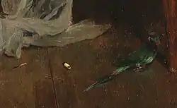 In the painting, in a witty transposition, Stevens’ model takes a break from posing and peeks around the psyché that stands in for the canvas on an easel. The artist's presence is implied by his cigarette butt, ash, and extinguished match on the floor (Stevens was a heavy smoker). There is a parrot, which signifies the act of imitation—just as the bird mimics human speech, so the artist imitates (or "mirrors") life. The Japanese prints in a portfolio reveal the artist's interest in Asian art. Stevens was an early collector, and he advocated Japonisme, which became increasingly available after a treaty opened Japan to international trade in 1854. Like Rembrant, Stevens was renowned for his ability in portraying exotic objects.[3][1]