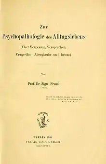 Psychopathology of Everyday Life (German: Zur Psychopathologie des Alltagslebens) is a 1901 work by Sigmund Freud, the founder of psychoanalysis. Based on Freud's researches into slips and parapraxes from 1897 onwards,[1] it became perhaps the best-known of all Freud's writings.[2]