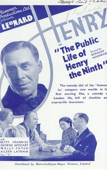 The Public Life of Henry the Ninth is a 1935 British comedy film directed by Bernard Mainwaring and starring Leonard Henry, Betty Frankiss, and George Mozart. This film was the first film made by Hammer Productions, and was Henry's film debut. It is set largely in the bar of the Henry VIII public house, with the title alluding to the 1933 Oscar-winning film The Private Life of Henry VIII.