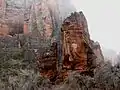 The Pulpit is a 4,600-foot (1,400 m) elevation Navajo Sandstone pillar located in Zion National Park, in Washington County of southwest Utah, United States.[2] The Pulpit is situated in the Temple of Sinawava at the north end of Zion Canyon, rising 160 feet (49 meters) above the canyon floor and the North Fork of the Virgin River which drains precipitation runoff from this rock. It is a photographic icon seen from the parking area at the end of Zion Canyon Scenic Drive, and the entrance to The Narrows. Neighbors include Mountain of Mystery to the north, Observation Point to the southeast, Angels Landing and The Organ to the south, and Cathedral Mountain to the southwest. The first ascent was made April 15, 1967, by Fred Beckey, Eric Bjornstad, Hal Woodworth, Pat Callis, and Galen Rowell.[3]