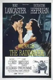The Rainmaker is a 1956 American western romance film directed by Joseph Anthony and adapted by N. Richard Nash from his 1954 play The Rainmaker. The film tells the story of a middle-aged woman, suffering from unrequited love for the local town sheriff; however, she falls for a con man who comes to town with the promise that he can make it rain. It stars Burt Lancaster, Katharine Hepburn, Wendell Corey, Lloyd Bridges and Earl Holliman. Holliman won a Golden Globe Award for his performance.