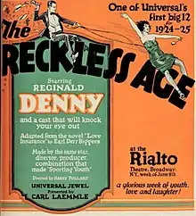 The Reckless Age is a 1924 American silent comedy-drama film directed by Harry A. Pollard and starring Reginald Denny. It was produced and distributed by Universal Pictures. It is based on the novel Love Insurance by Earl Derr Biggers and is a remake of an earlier Paramount film Love Insurance (1919), which is now lost.[1]